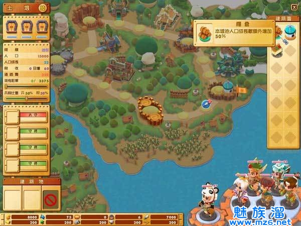游戏增加了对城池的任务,可以酎量情势规划城池的建设方向。在城中建设护城河可增加城市的防御力,市集可增加城市的税收,粮仓可加快人口成长。练兵场可训练兵,兵营可进行征兵,书院可增加驻城武将的智力。其中市集和兵营可多多建造。如果守城的将领智力不高,应建书院增养武将的智力。城池中还有聚贤庄.藏经阁.医馆等场景,相应地有其特定的功能。
