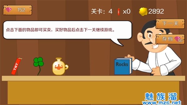 3、游戏的前三关是不相同的,而后面的7关是循环关,钻石只有在第三关才有,而袋子有时会有,玩家一定要抓住每一个袋子。每一关过后都会有一个商店,玩家要明确商店内的简介。