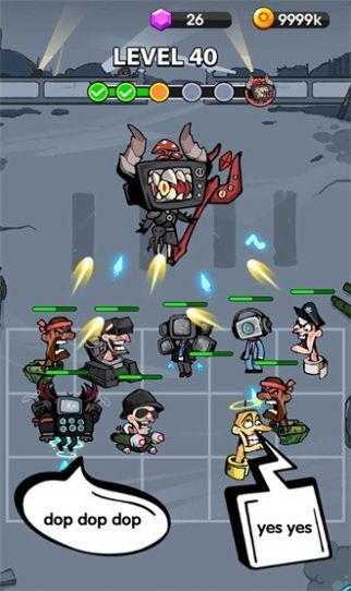 战胜前几波后,强大的boss将会来袭,你需要组建强壮的阵容才能避免游戏失败。