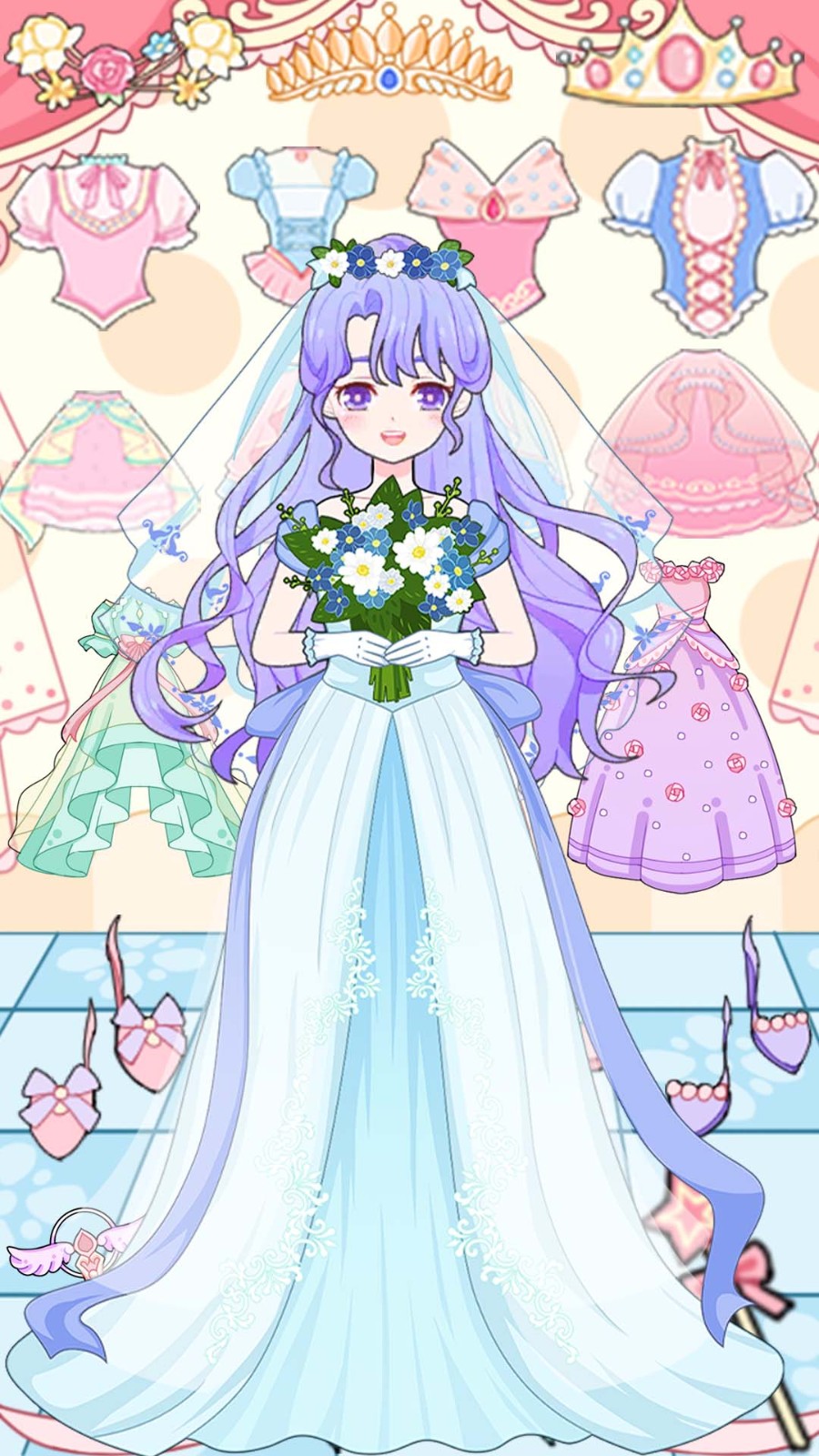 2、可以根据自己的喜好选择不同的配饰,从头饰到项链,一应俱全;
