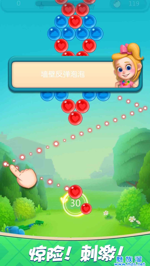 2、策略性地利用有限的泡泡资源,清除下方的所有泡泡以过关;