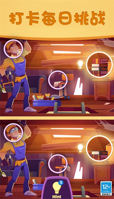 2、双图对比找不同玩法,细节考验眼力与专注度,锻炼玩家观察分析能力;