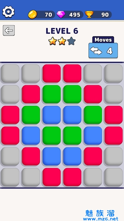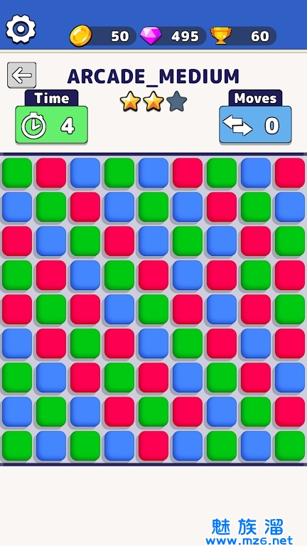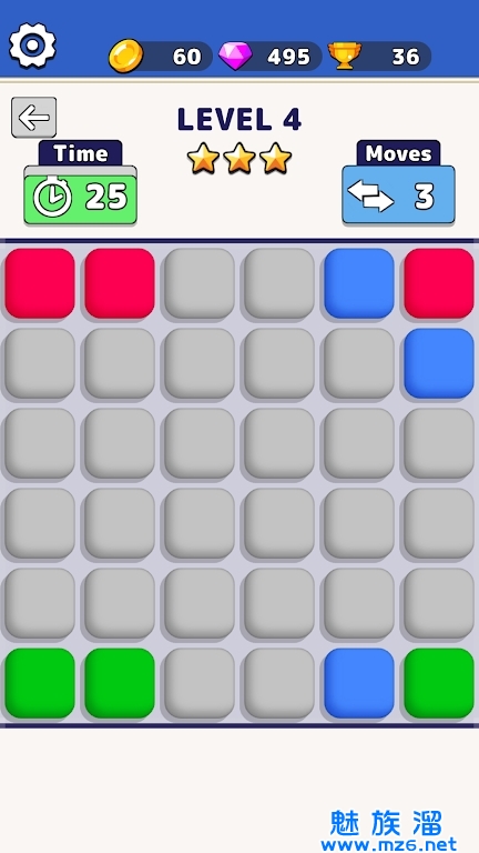 2、随着游戏难度的提升,规定的时间内匹配越多颜色的方块越好;