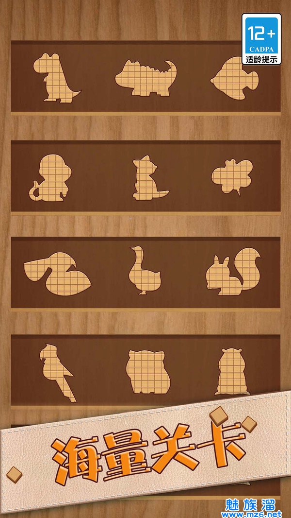 1、创新几何方块拼图,分离动物形象设计,寓教于乐,锻炼玩家空间想象力;拼图的形状五花八门的,加大了难度,需要花费很大的心事;