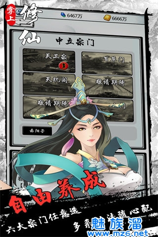 2、众多宗门林立与九州世界,你可以学习各家武学之长,研发自己的专属绝技;功法组合,六大宗门,12种修行方向,数百种功法,成就一条属于自己的修仙之路。