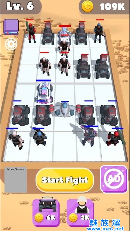 2.融合相同的战士来提升你的等级和攻击力;在杀敌过程中不断获得强化道具,状态溢出后爆发直接清除全屏敌人;