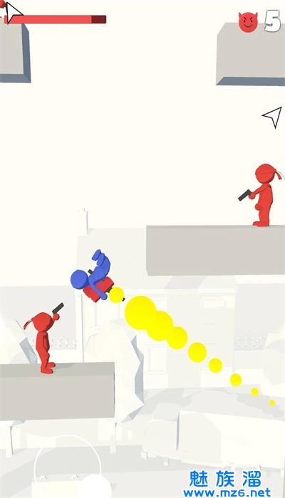 1、通过拖拽调整布娃娃发射角度和力度,瞄准敌人进行物理弹射打击;