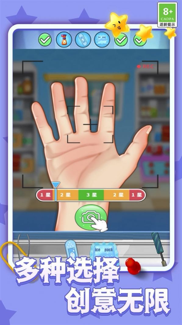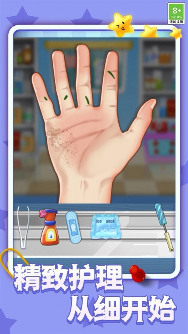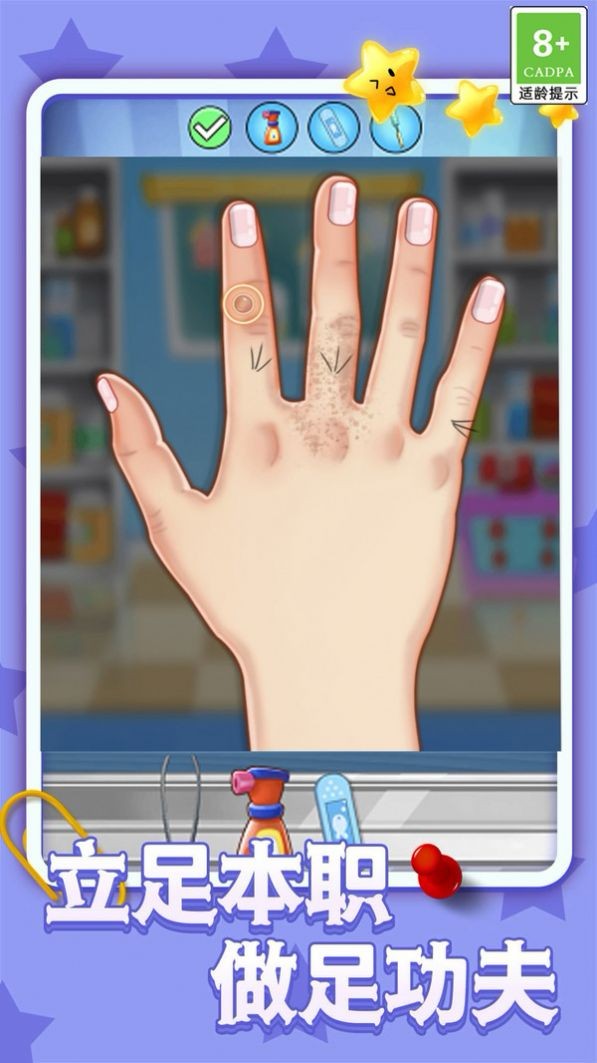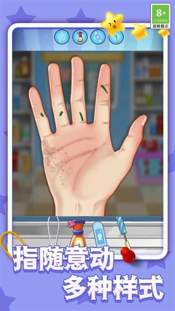 1、扮演掌医,玩家化身专业医生,处理各类手部疾病和伤口;