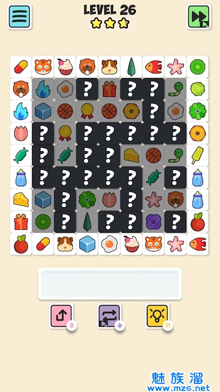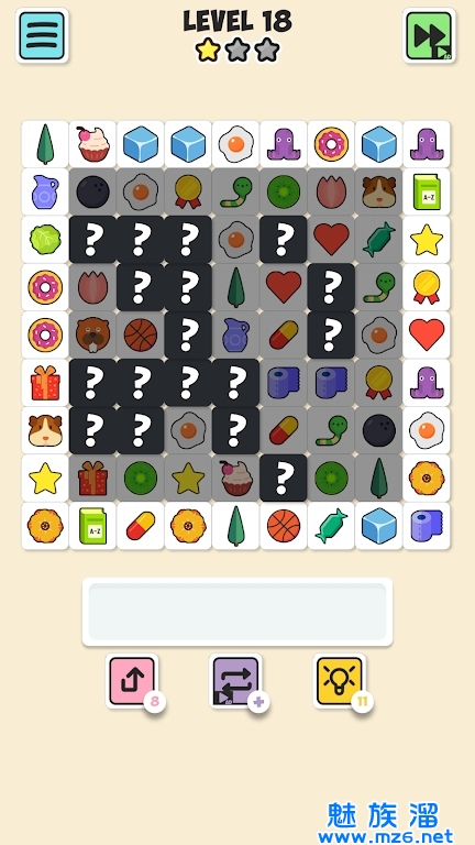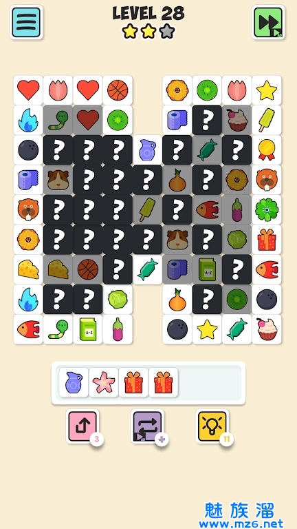 1、主要玩法是通过相同的图案进行瓷砖配对消除,达到游戏目标。