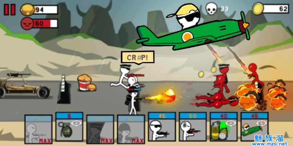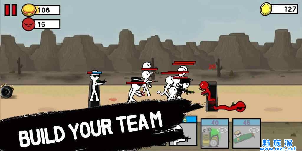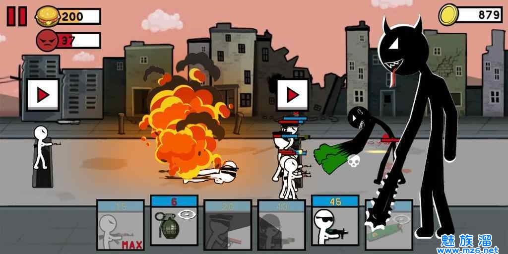 2.横版射击结合战术部署,玩家扮演指挥官的角色,派遣多兵种火柴人部队进行战斗;