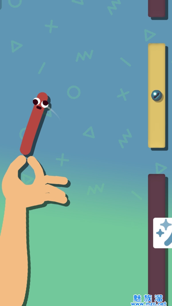 1、轻触屏幕调整发射角度与力度,控制香肠角色弹跳通过重重障碍到达终点;
