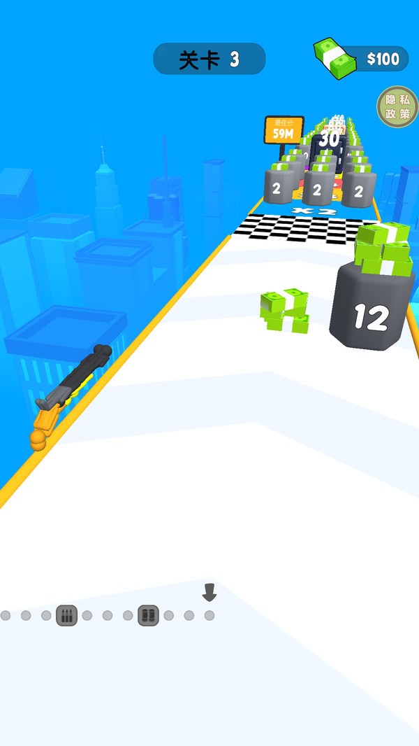 我有一把枪是一款画风简约的休闲益智类跑酷小游戏,游戏中玩家将会扮演一名神秘特工,在各个不同的场景中进行跑酷挑战,而在跑酷的过程中玩家还可能会遇到各种各样的障碍物和陷阱,玩家需要使用手中的武器应对途中遇到的敌人和障碍物。