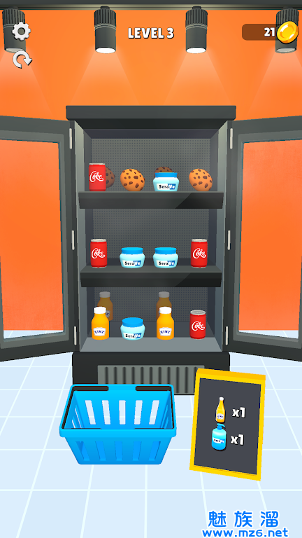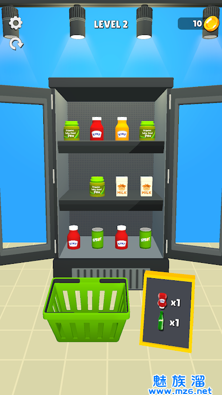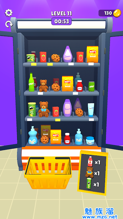 1、休闲游戏,玩家需要在有限时间内将货架上的商品整理匹配,以满足顾客要求。