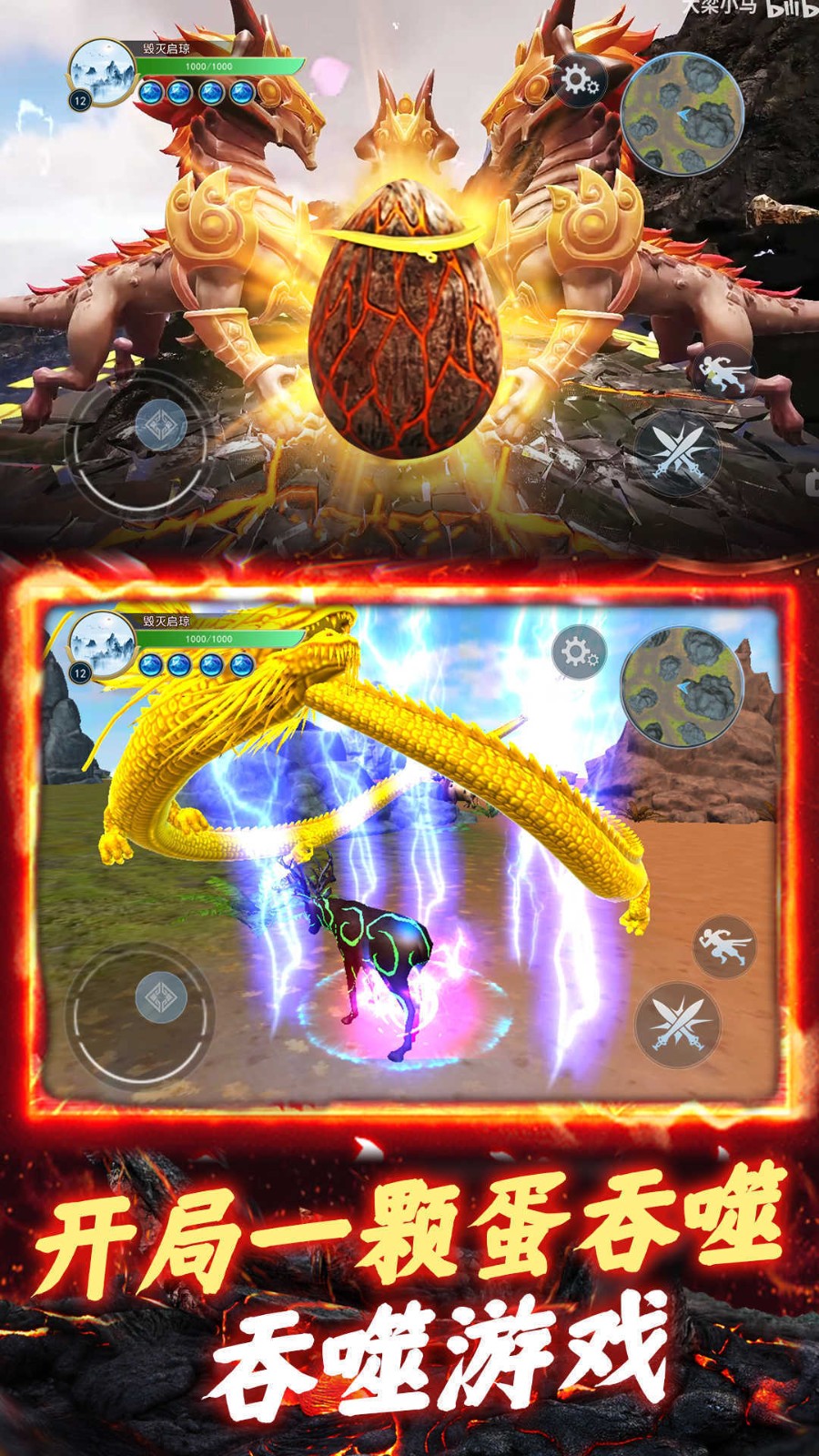 游戏中会刷新神蛋,吞噬后可以获得大量经验。偶尔还会刷新出巨龙,一个黑色影子落在头上,没躲开就是秒杀。