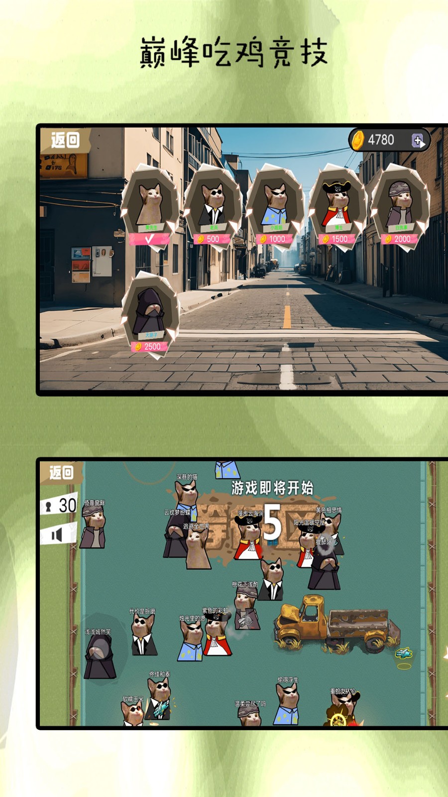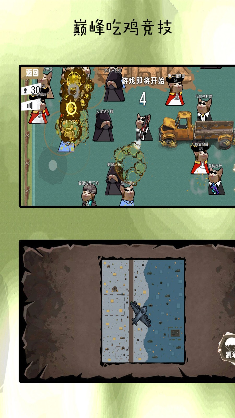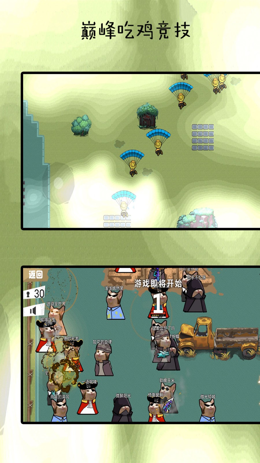 巅峰吃鸡竞赛是一款以可爱猫猫头为主题打造的角色扮演类枪战射击游戏,游戏以吃鸡为主要玩法,玩家需要和其他的猫猫头玩家一起被投放至荒岛上,在荒岛上搜寻武器、装备,武装自己提升自己的战斗能力,消灭自己探索途中遇到的所有敌人,直到最终成为最后一个活人获得胜利。