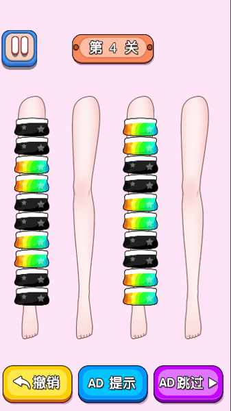 逻辑大脑洞是一款非常有趣的休闲益智类解谜小游戏,游戏玩法非常独特,玩家需要将关卡中提供的丝袜一起穿在一条美腿上,玩家需要不断的移动丝袜,让丝袜能够顺利的穿到美腿上,体验各种丝袜美腿。游戏玩法非常独特,感兴趣的小伙伴快来试试吧。