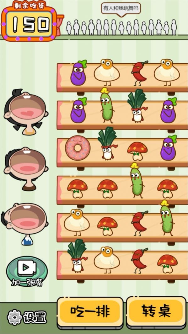 2、点击三个相同食物,喂饱一个吃货,来感受这款轻松解压的创新三消小游戏吧;
