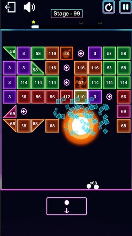 2、随着玩家游戏的进行,砖块的数量以及砖块上的数字都会变大,玩家需要一次击中多块砖块才能成功通关;