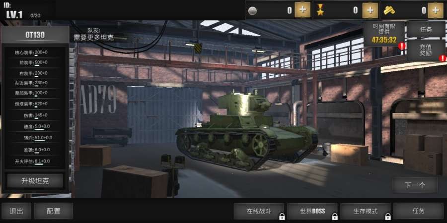 4、通过完成任务或战斗赚取金币和经验,可以用来升级你的坦克和装备,增强你的实力。