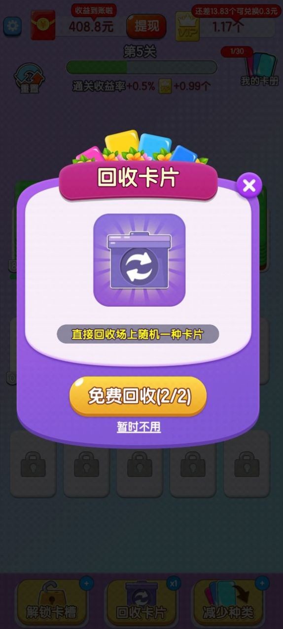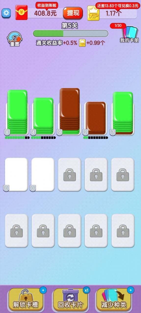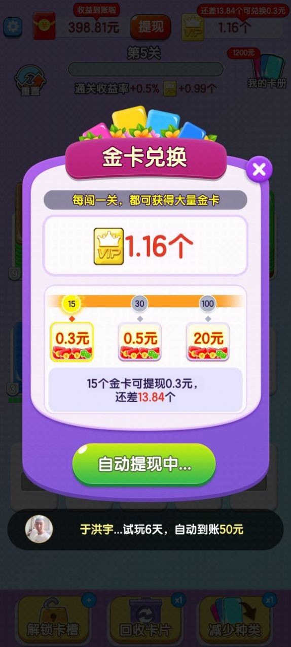 欢乐卡片是一款很有意思的休闲闯关小游戏,游戏结合了卡片、闯关、合成等游戏元素,玩家可以在游戏中通过不断的合成来获取高级卡牌,通过一步一步的合成,将最低级的卡牌升级为更加高级的卡牌,获得游戏中的红包奖励。