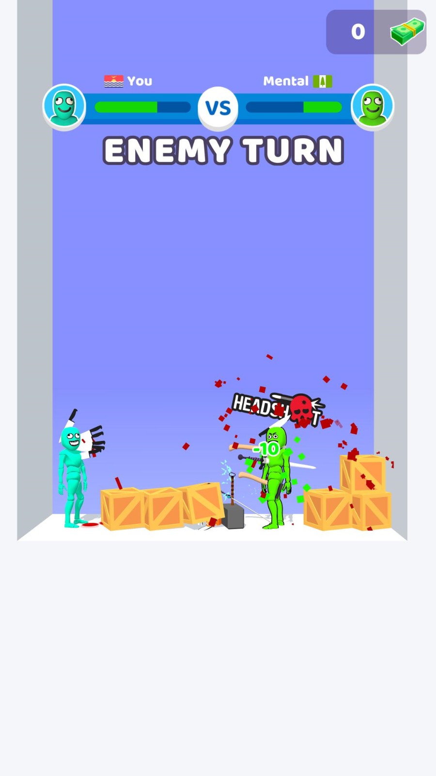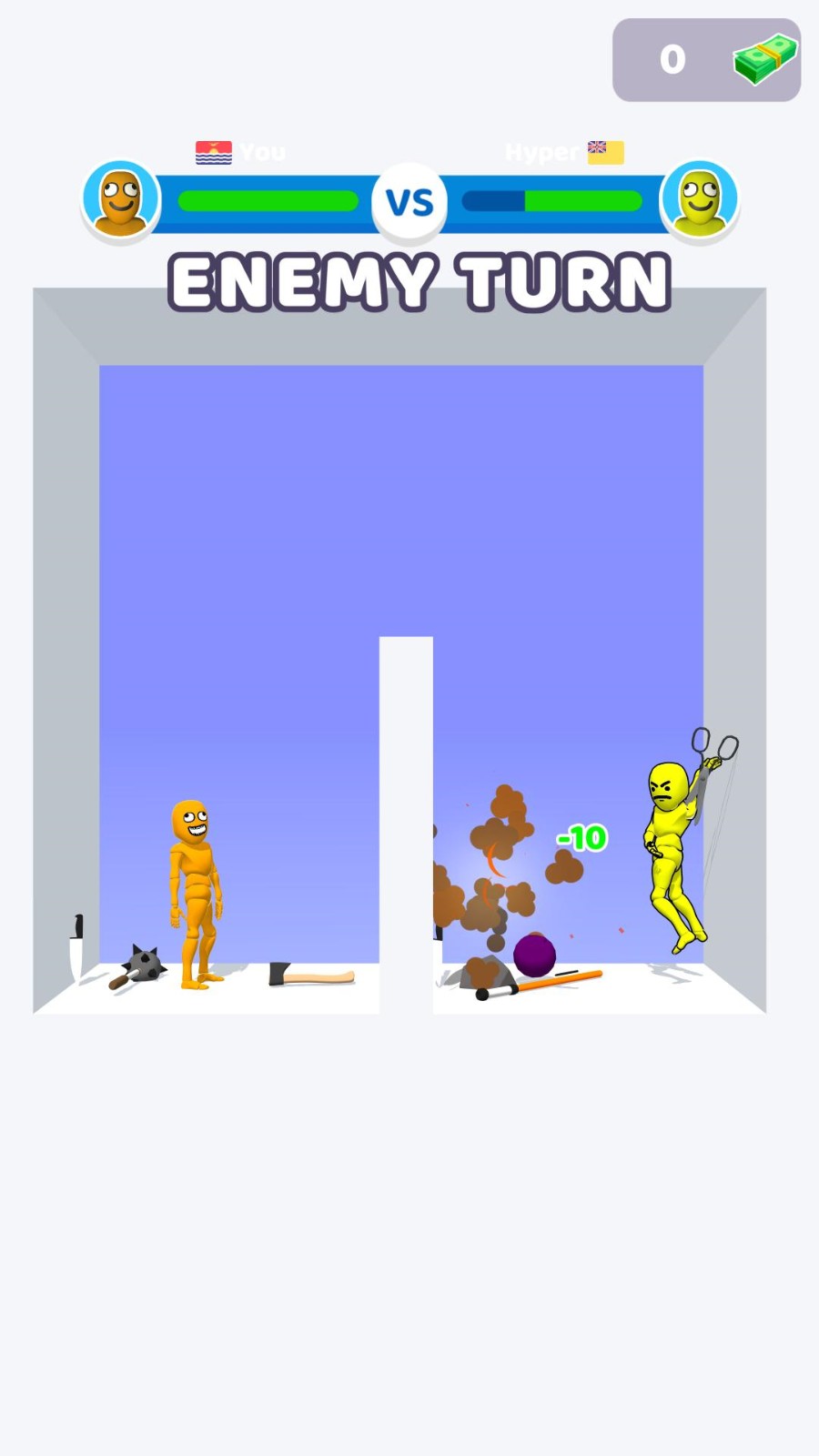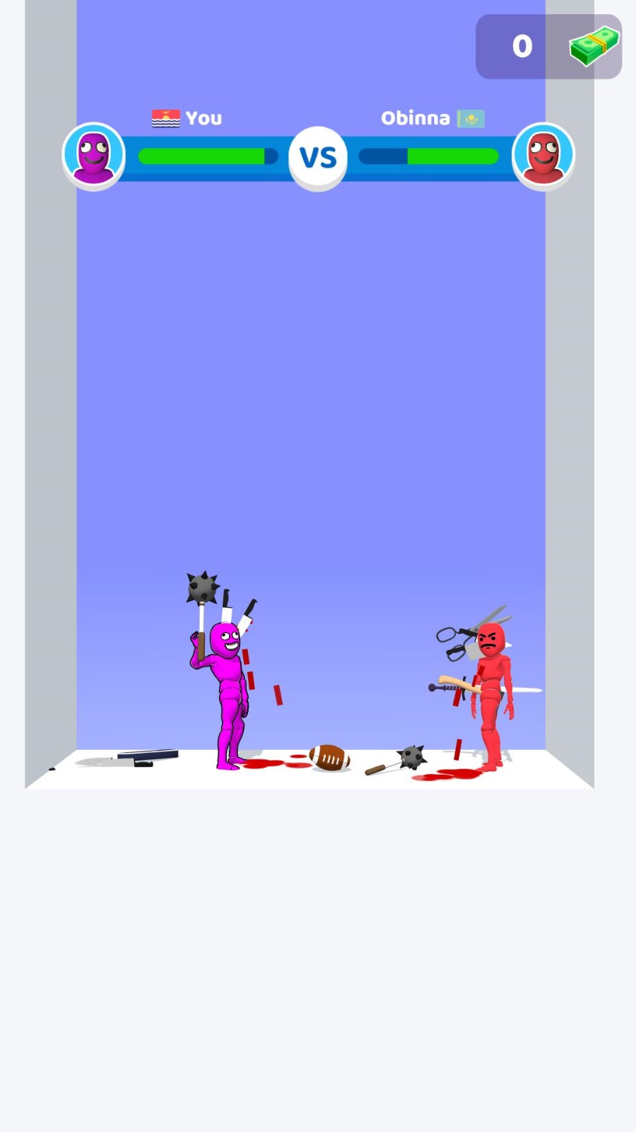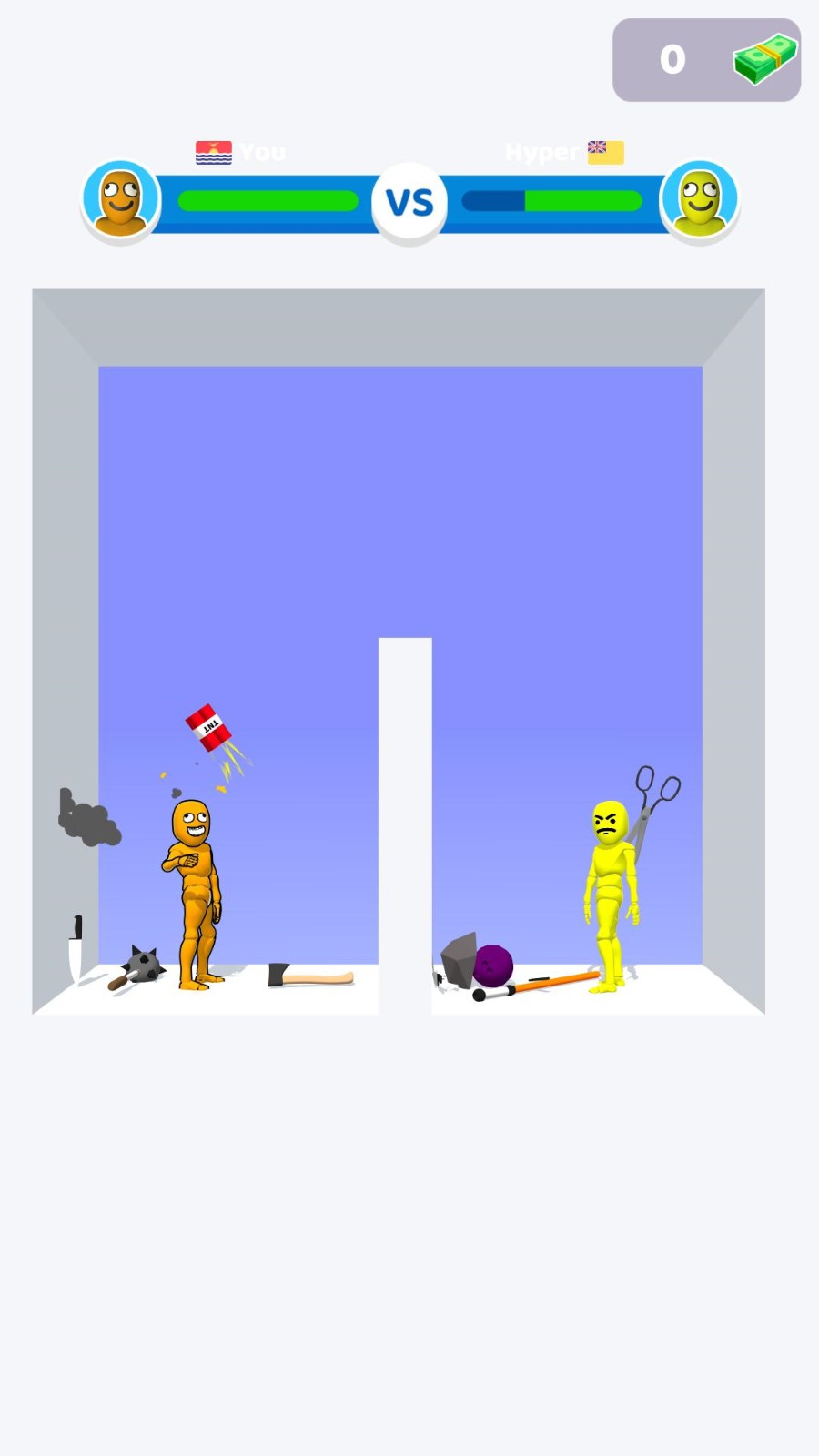 1、操控火柴人战士,运用各类奇葩武器展开激战,击溃对方血量至零;