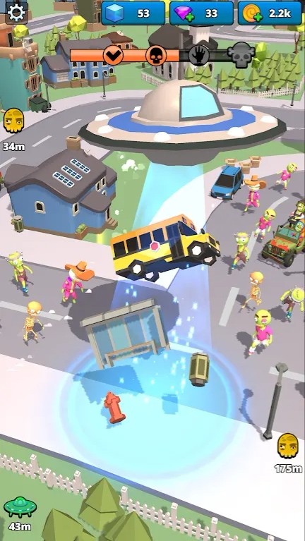 2.飞碟吞下的每一个物体都会给予经验值,可以用来升级和强化飞碟的能力。