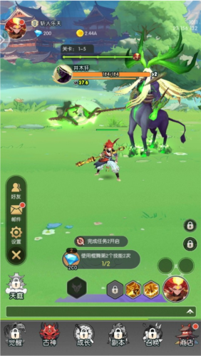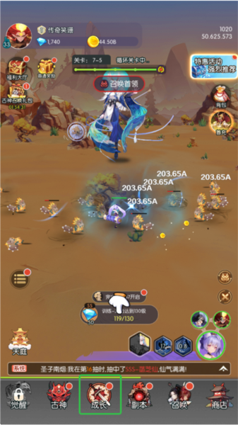 2、主线的关卡战斗分为两种:普通小怪和精英首领,玩家只要在线古神伙伴就会一刻不停的攻击普通小怪,这个过程中会累积大量的金币、修炼石等资源,而精英首领则需要玩家进行手动召唤,每击败1名精英首领即代表完成1个关卡的挑战。