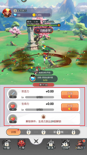6、主角养成是对战力提升最大,却也最简单的机制,游戏简单粗暴的将战斗数值分为攻击力、生命力、生命恢复、暴击、格挡等十余种不同的属性,每一种属性都是通过消耗“金币”来进行提升,在养成和提升过程中几乎没有任何限制,只要你愿意,你甚至可以将所有资源都集中到攻击方面,造就一个输出无敌,但一碰就倒的“无敌”团队,这也是游戏中玩家铸就个人战斗流派风格的主要途径,需要注意的是这里所有属性的养成都是共用一个金币池,所以金币等养成资源的分配也是游戏的一大策略点!