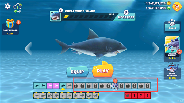 4、可以看到,还有很多锁住的鲨鱼无法直接解锁,你需要逐一解锁才可以