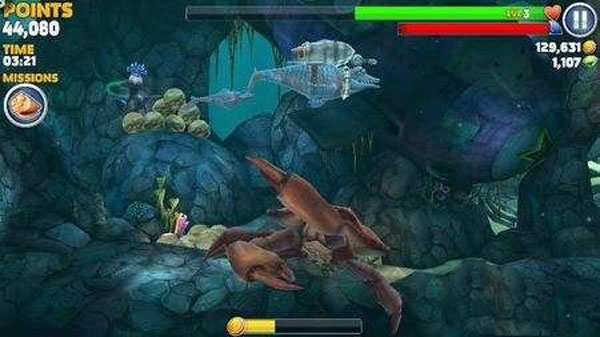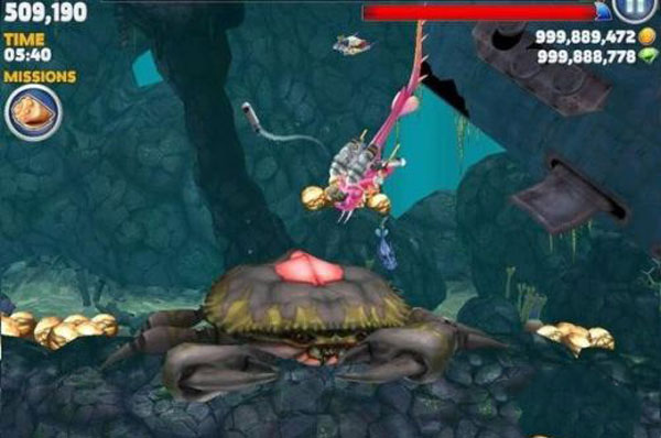 游戏中时间越长,鲨鱼饿得越快。所以趁早去螃蟹洞。尤其是黑螃蟹,还要先打出50万分。