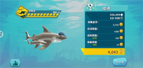 这样我是差不多不到九分钟的存活时间,我用双髻鲨就收集了不到4000的金币,存活奖励就260了,这可是我玩饥饿鲨的一个新高,也算是很惊喜啦!