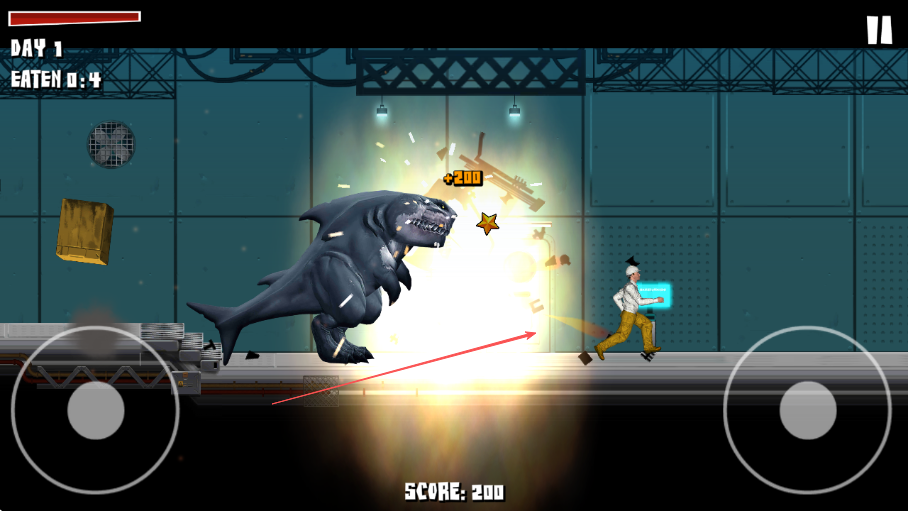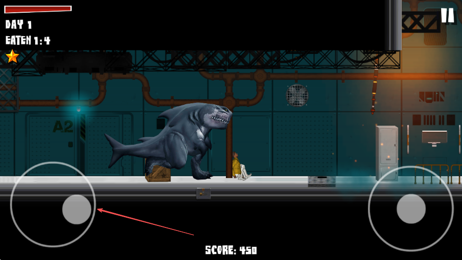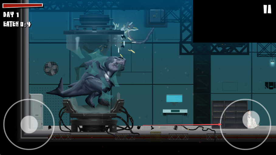 1. 游戏开启后,留意左上角的DAY1和EATEN0:4,当出现BITE提示时,点击按钮,使鲨鱼龙咬碎玻璃。