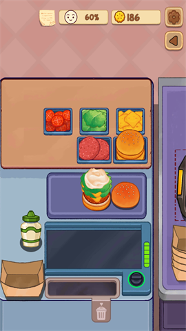 2、玩家可自主挑选食材,把各类肉类、蔬菜、酱料等加以组合,打造出独具风味的汉堡。