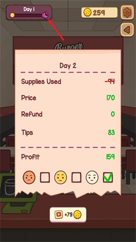 6、一天的时间显示在左上角,一天结束后会对当天收入进行结算。