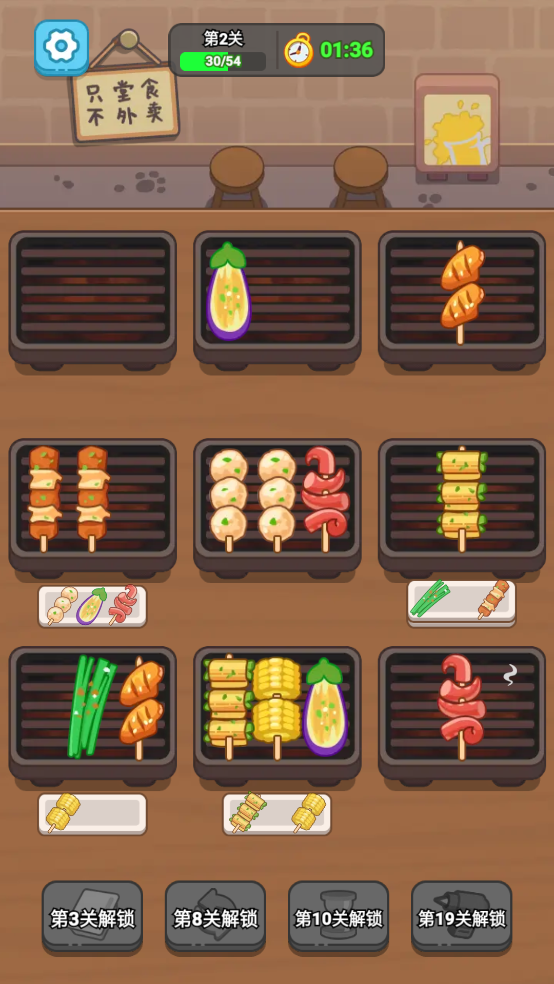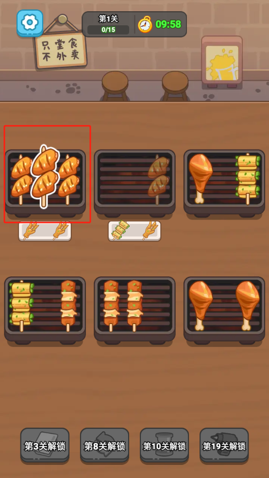 优先消除高价值烤串:肉类烤串(如牛肉串、羊肉串)消除后获得的金币比蔬菜串更高,可优先集中摆放肉类烤串,提升金币获取效率。