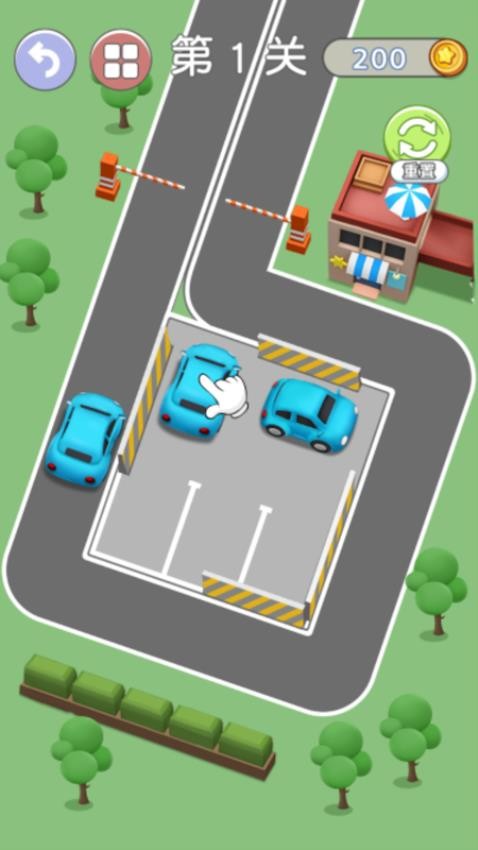- 场景观察与阻碍分析:每关开局先整体浏览场景——①标记目标车辆(通常用特殊颜色或闪烁提示)与目标车位;②识别固定障碍物(如石墩、护栏)与可移动车辆的位置关系;③判断车辆移动的“可行路径”(无障碍物阻挡的直线方向)。例如:若目标车位被一辆横向轿车挡住,需先观察该轿车是否有向左/右滑动的空间,若右侧有空位,则可先将其右移腾出路径。
