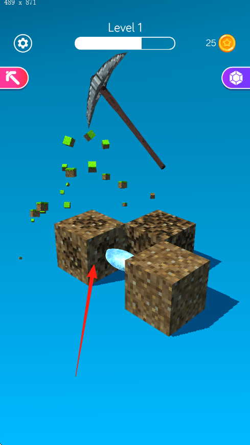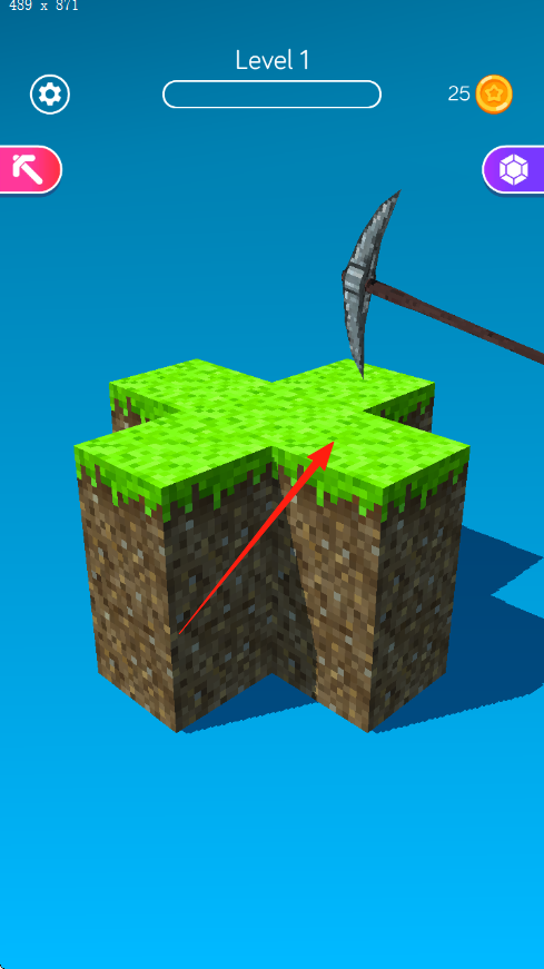 1. 在Level1进行矿石挖掘,操作铁镐,点击绿色草地的方块,随后开启挖掘,一层一层地破除土壤。