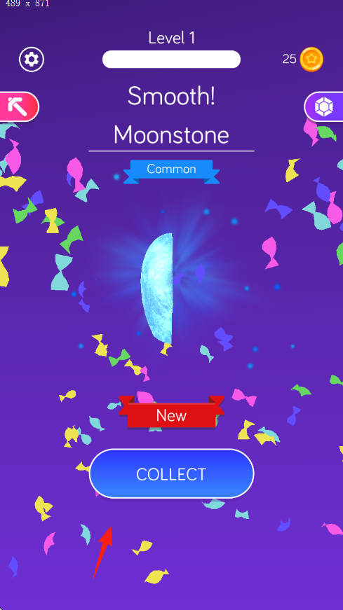 3、在关卡结算时挖到“Moonstone(月光石)”,点击“COLLECT”领取奖励(25金币),随即解锁新关卡。
