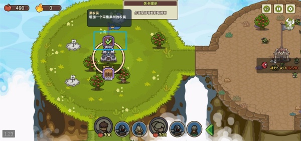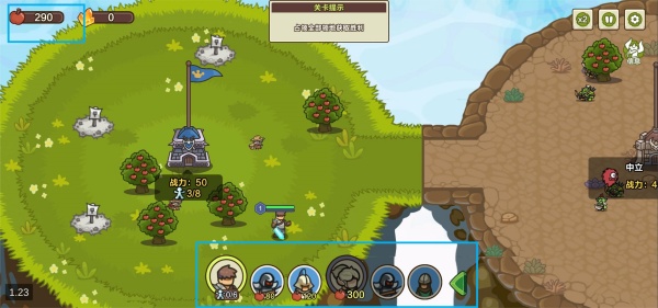 2. 踏入关卡后,对城堡进行双击操作来招募农民,首先着手采摘果树,以此为后续的发展积攒资源。