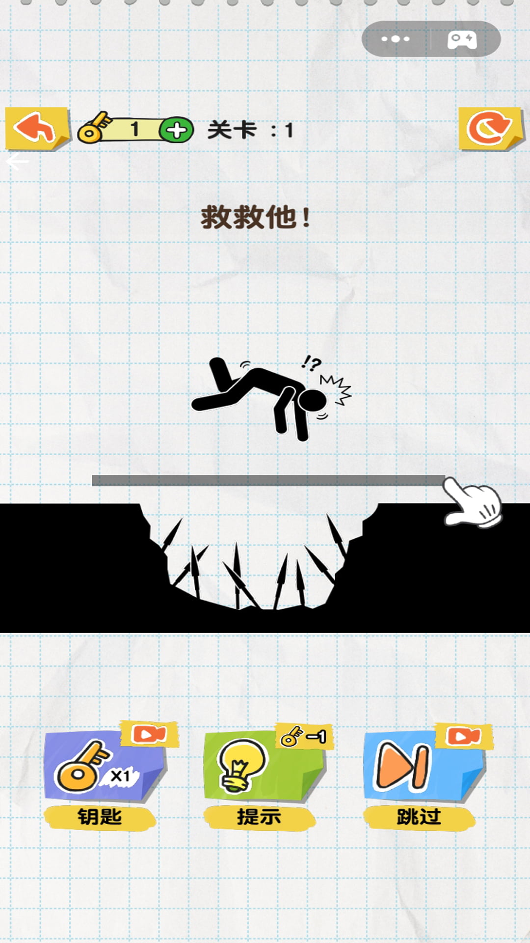 1. 选择主线关卡,进入关卡后,留意火柴人危机中掉落陷阱等情况,同时在屏幕上通过划线的方式补路并解谜。
