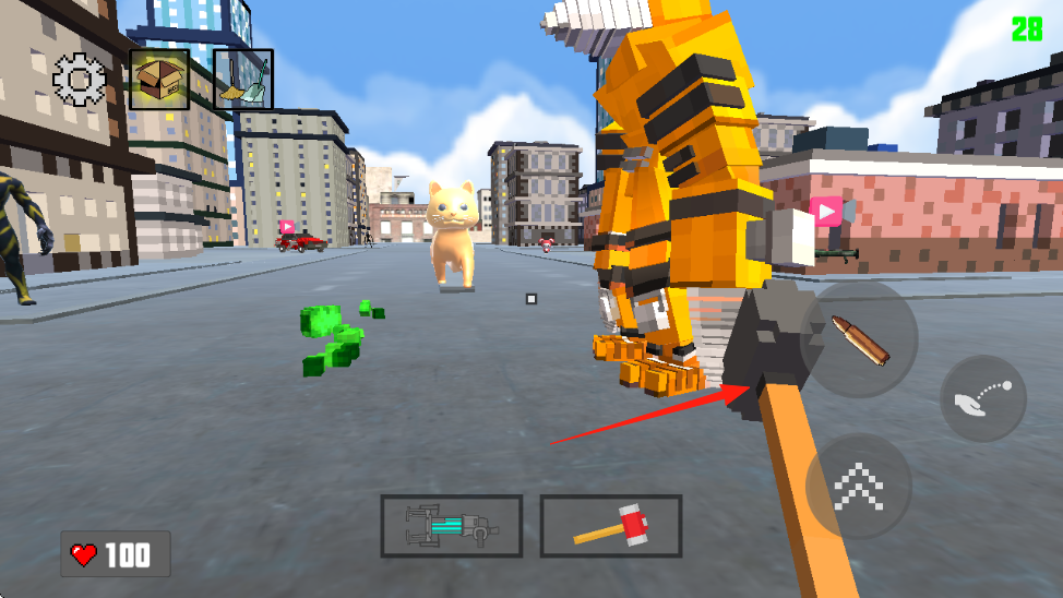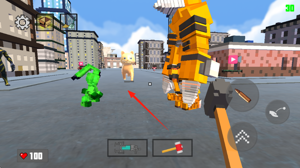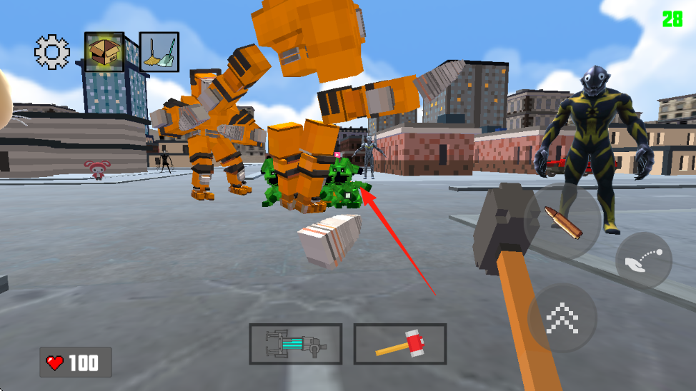 1. 以角色第一视角进行操控,身处城市街道场景,运用武器锤子对绿色生物、黄色机器人等敌人展开攻击。