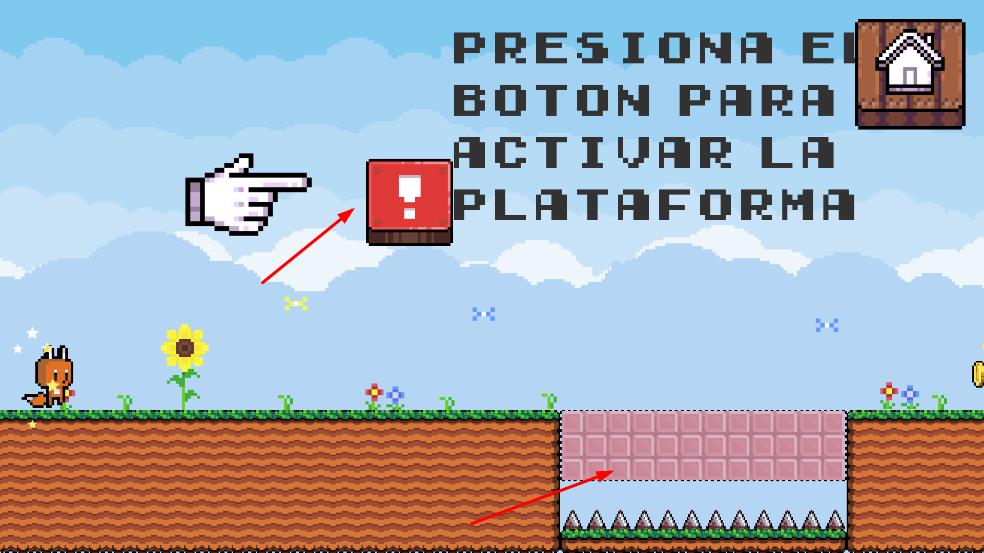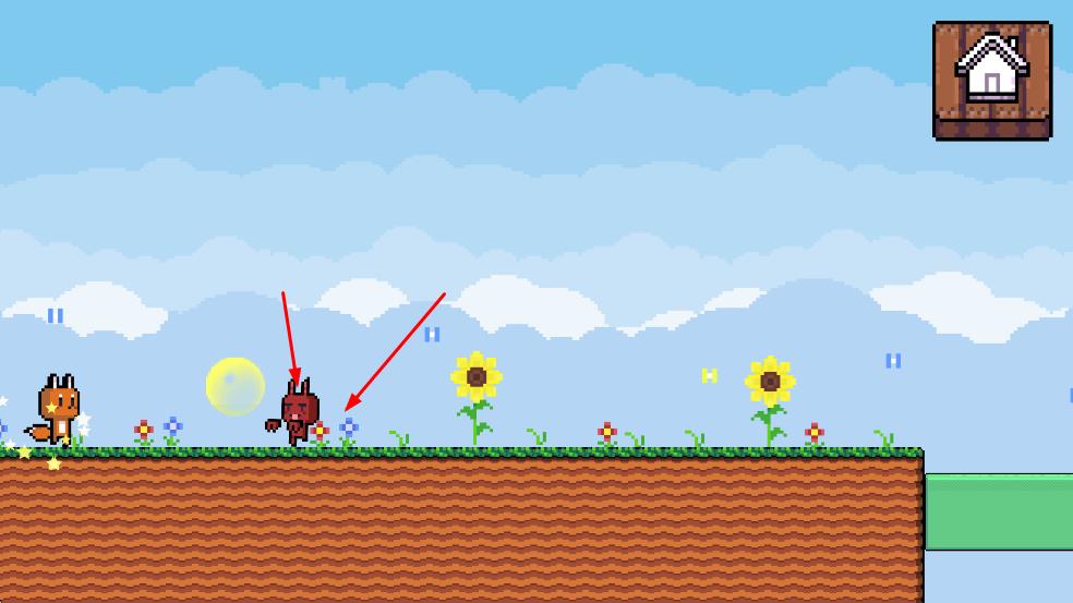 1. 控制橙色的小狐狸这一角色,在具有像素风格的场景里进行移动,该场景包含草地、花朵以及不同颜色的平台等诸多元素。