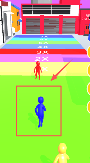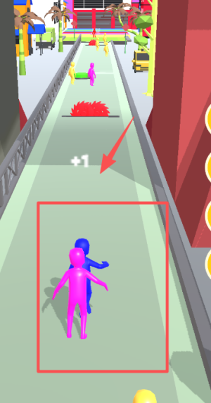 3、游戏进行时,通过手指操控蓝色小人,使其躲开后方的红色小人。当蓝色小人靠近彩色区域,就能获取倍数加成,助力你更迅速地积攒分数。