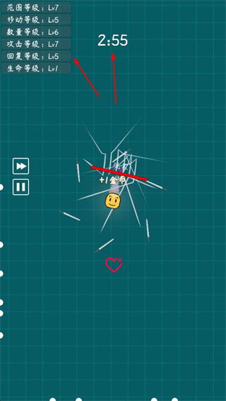 4、持续提升各项属性的等级,在限定时间内生存下来并打败敌人,向着更高的属性等级以及更久的生存时间这一目标奋进。