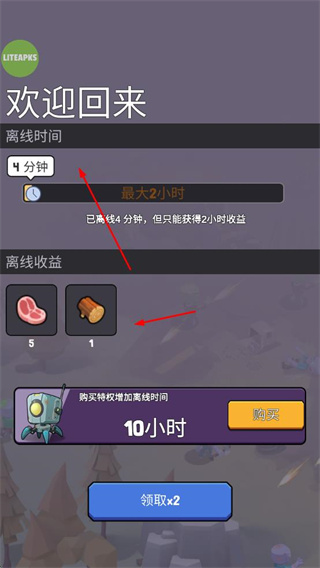 1. 具备离线收益功能,离线状态下能够获取肉类、木材等资源。离线时,最多可获取2小时的收益。倘若你有需求,还能通过购买特权来延长离线时间。