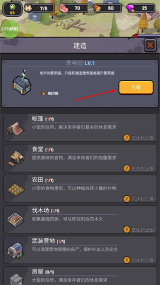 2、于建造界面,能够对发电站等建筑进行升级,以此提高城市繁荣度。同时,还能够建造诸如帐篷、食堂、农田、伐木场、武装营地、房屋等设施。