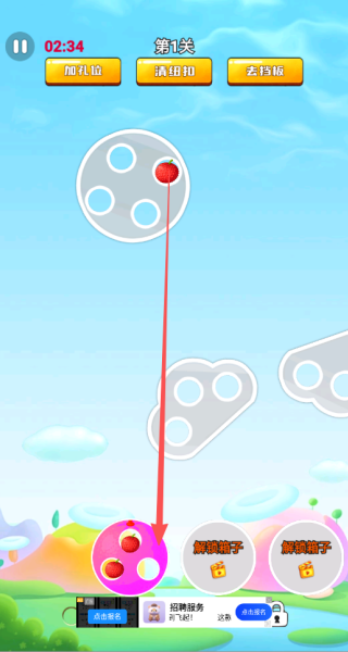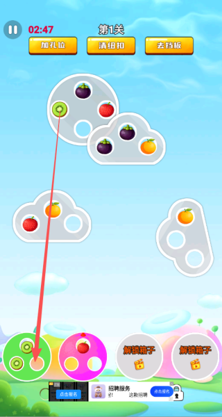 4、要合理运用上方的各类道具。当出现孔位不够、纽扣阻挡或者挡板遮蔽的情况时,需马上使用相应道具,以便为水果的移动与合成营造有利条件。