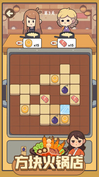 方块火锅店是一款主打“方块消除+模拟经营”的可爱休闲游戏,以简约清新的画风构建出充满烟火气的火锅店场景。游戏巧妙融合两种核心玩法:消除端,玩家需将屏幕下方随机掉落的不同形状积木,精准放置到上方的方格区域,当某一行或某一列被方块完全填满时,即可触发消除效果;经营端,消除不同列的方块对应为火锅店内的顾客提供食材,需优先满足顾客订单需求,确保食材及时供应。