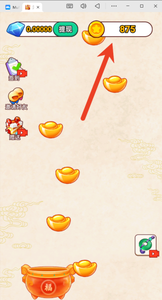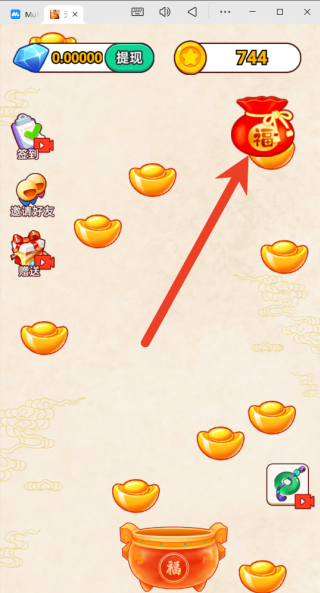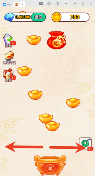 2、只需用手指在屏幕底部左右滑动,就能操控您的角色随之移动,同时尝试精准对准从屏幕上方持续掉落的金元宝、铜钱等代表财富的道具。