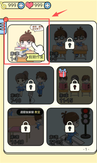 1. 在画面的红色方框里,找到表情焦急的卡通女孩角色并点击,接着依据右上角箭头的指示,开启第一章第三关的假期作业挑战。